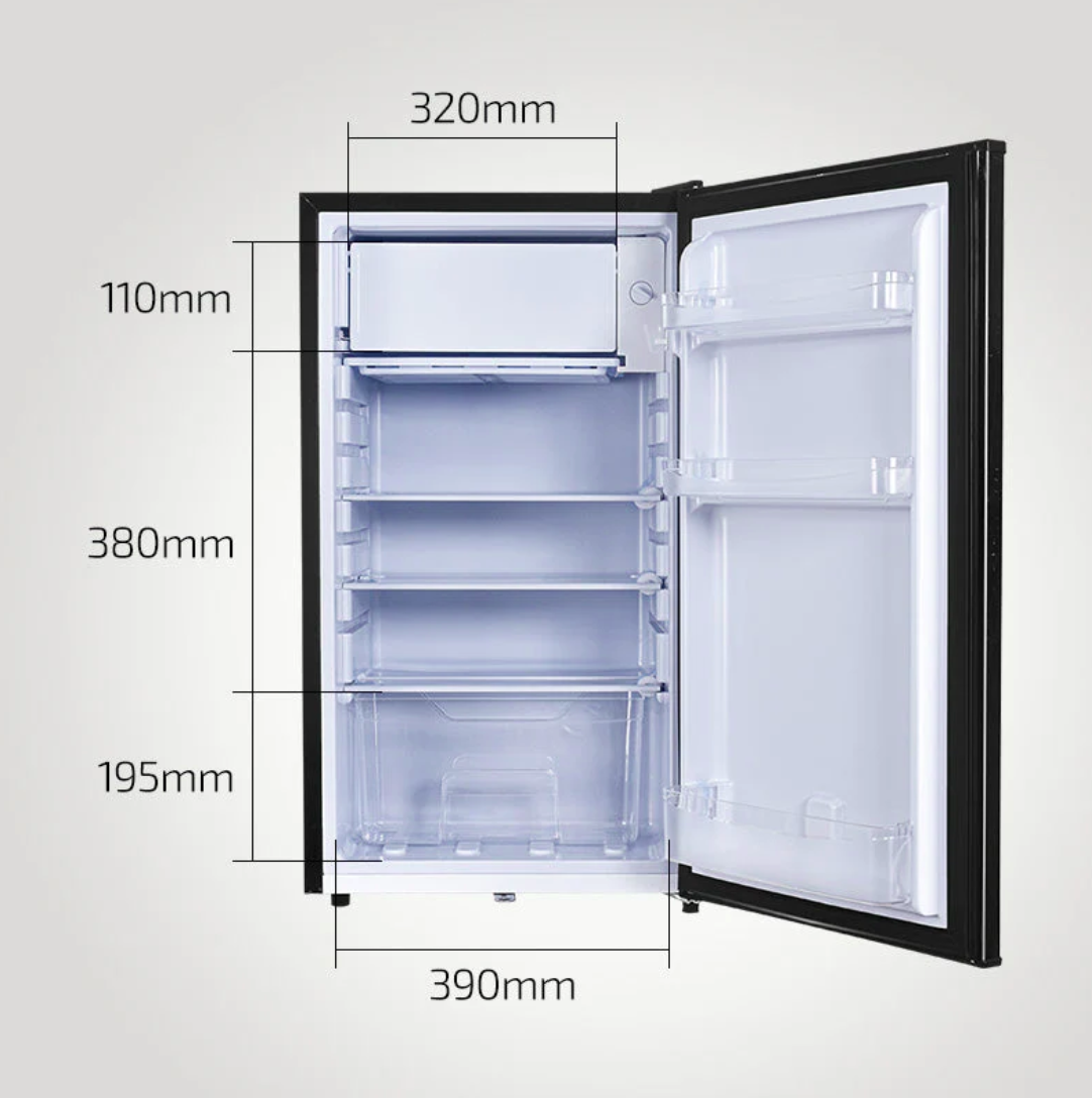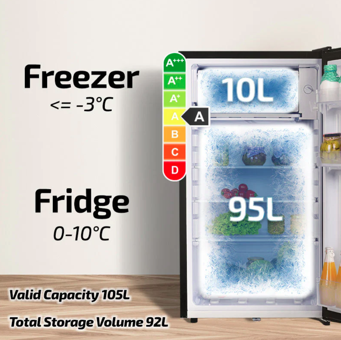 • Fridge / Freezer compartment size: 95L / 10L , Valid Capacity 105L, Total Storage Volume 92L.