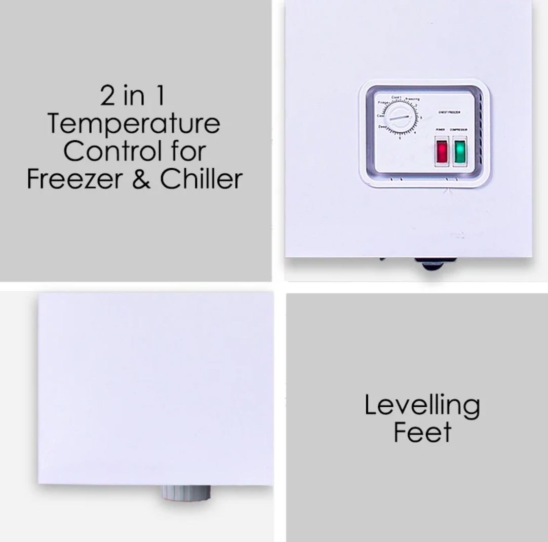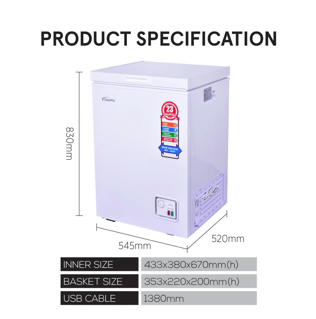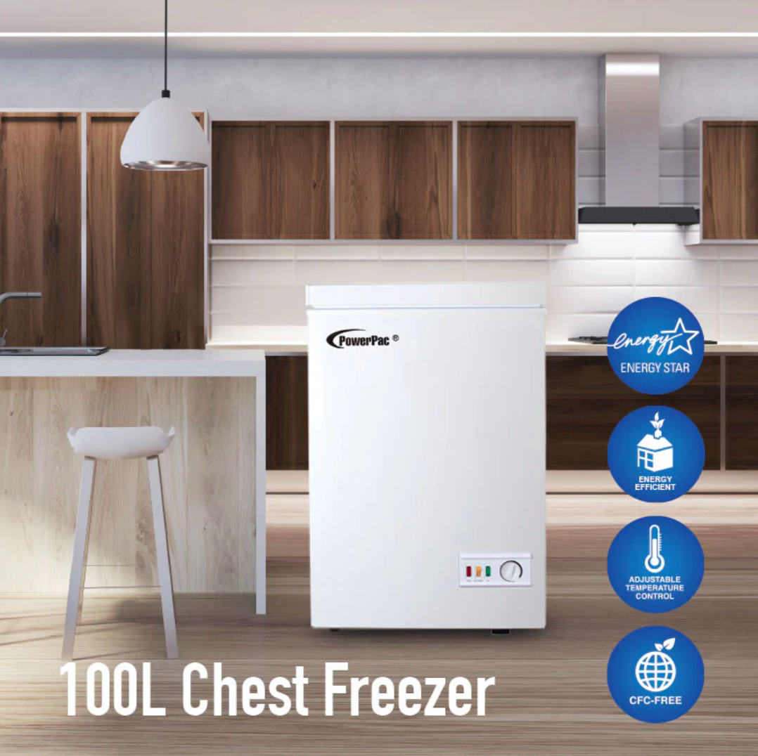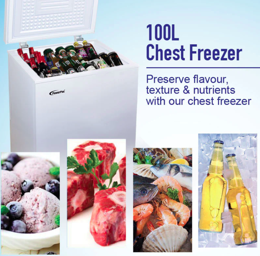 The PowerPac 100L Chest Freezer PPFZ100, available in white or black, is equipped with a powerful compressor. Food is frozen within minutes of being placed in the Freezer, sealing nutrients and retaining flavours of food.