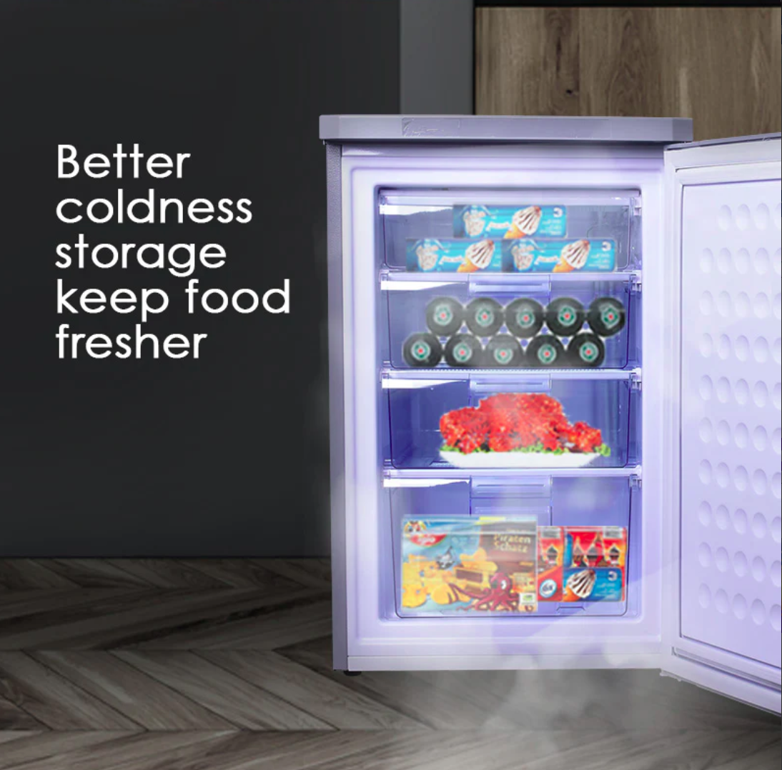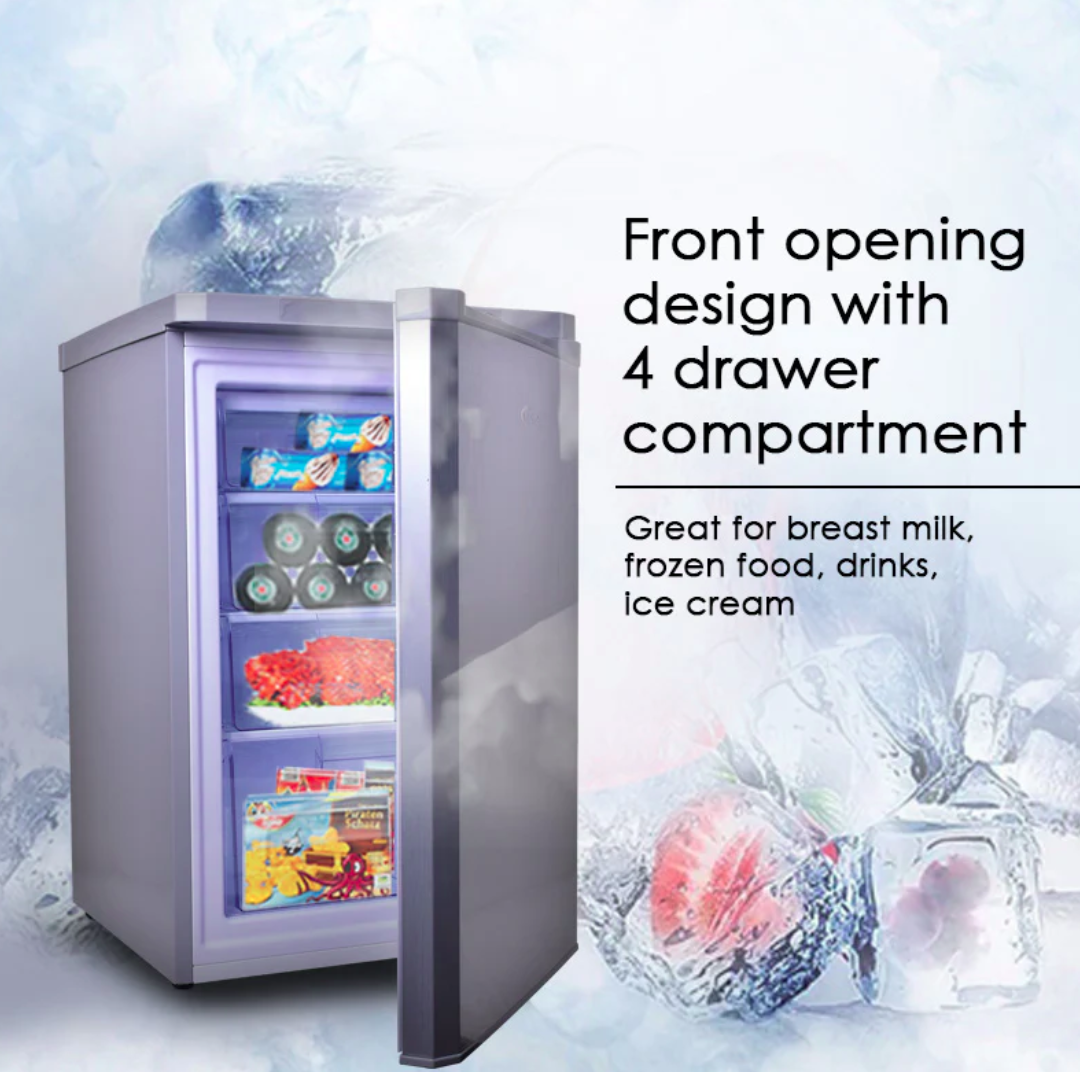 The 90L Chest, Upright, Freestanding Freezer, available in silver (PPFZ99 Silver) or black (PPFZ99Black), is equipped with a powerful compressor. Food is frozen within a few hours of being placed in the Freezer, sealing nutrients and retaining flavours of food. With fresh air constantly circulating, foods stay fresh and rich with moisture, while the Activated Carbon Filter eliminates bacteria and removes odour in all 4 drawer compartments.