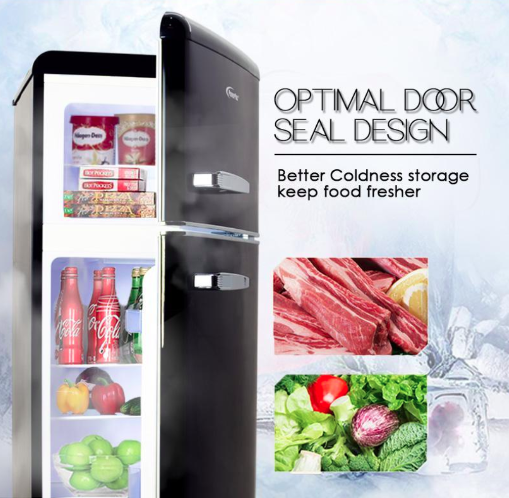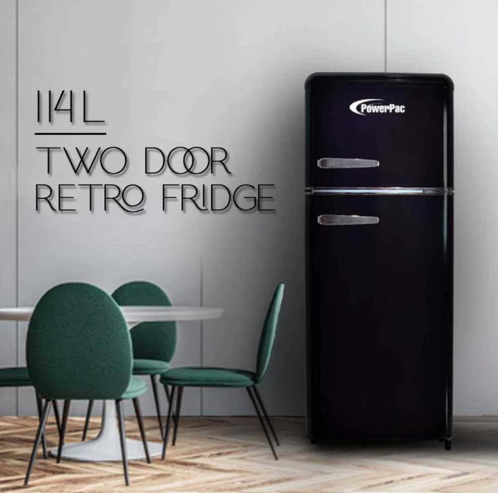 The 2-door Retro Fridge 114L PPF118 with a separate freezer on top is compact and ideal for small families.