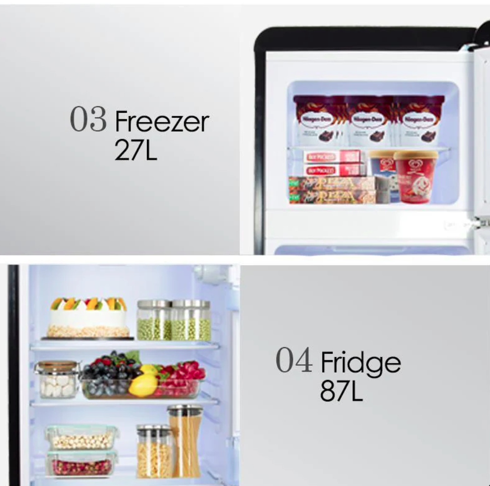The 2-door Retro Fridge 114L PPF118 with a separate freezer on top is compact and ideal for small families.